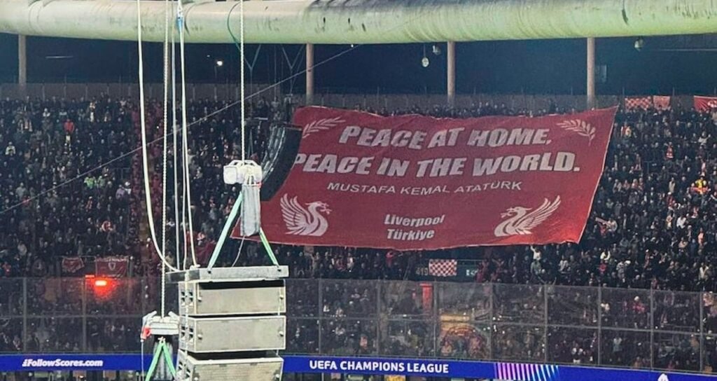 UEFA Şampiyonlar Ligi son 16 turu ilk maçında Galatasaray’a konuk İngiliz temsilcisi Liverpool’un taraftarları, RAMS Park’ta Ulu Önder Gazi Mustafa Kemal Atatürk’ün dünya barışıyla ilgili sözlerinin yer aldığı pankart açtı.
