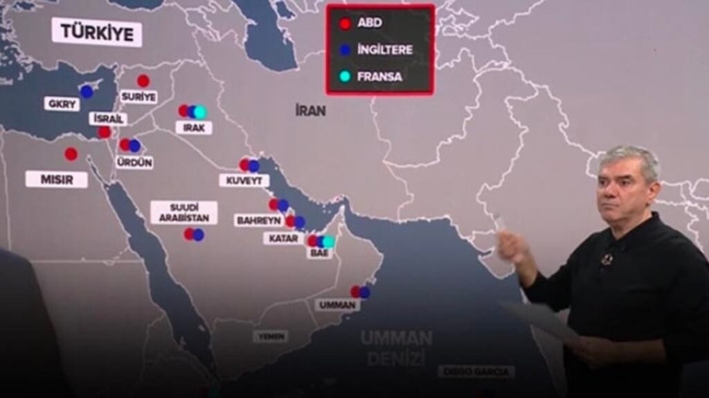 – Trump İran’a saldırdı, doğru ama eksik. Bakın şu harita şu anda Ortadoğu tabir ettiğimiz bölgedeki ABD, İngiltere ve Fransa’nın bulunduğu üsler. Ben size örnek vereyim. Bakın burada Dıego Garci diye bir ada var. Bombardıman üssü burası. Ta Nixon döneminde üs yapıldı. Cibuti üssü var. Orası 2001 yılında ABD tarafından üss yapıldı. Burası Bill Clinton döneminde üs oldu. Mısır’da 1950’den beri var olan bir üs var. Katar’da El Udeyd üssü 1996’da kuruldu. Centcom Karargahı da burada. Bahreyn’de ve Suudi Arabistan’da üs kurduklarında başkan Bush’tu. Ürdün’de 1981’den beri var üs.